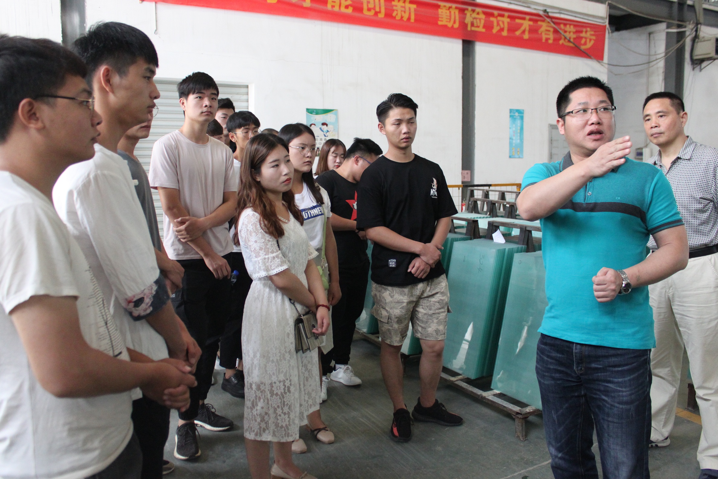 彩晶事業(yè)部長魏常宏的帶領(lǐng)下,綜合管理部葉、行政經(jīng)理馬向明的陪同下,我們來到了參觀的第一站:彩晶事業(yè)部制一部生產(chǎn)車間。魏部長細(xì)心的給同學(xué)們講解,并讓同學(xué)們看到了每一片玻璃從進廠、到切割、加工、打磨、水洗,到合格的離開這個廠區(qū)。車間機械的轟鳴聲,絲毫不減同學(xué)們的興趣與激情,同學(xué)們緊跟著隊伍,仔細(xì)的觀看,認(rèn)真的聆聽,雖然聽得也只是只字片語,但從同學(xué)們頻頻點頭可以看出,同學(xué)們都心領(lǐng)神會。