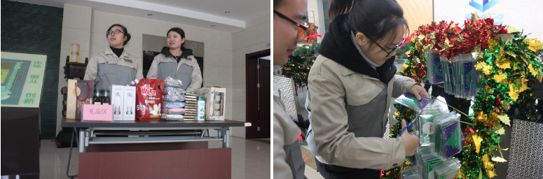 活動(dòng)現(xiàn)場(chǎng)設(shè)在行政大廳,經(jīng)過大家的努力,把大廳布置的非常漂亮,但前期的工作還是相當(dāng)大的,寫賀卡、組裝圣誕樹等,還搭配許多裝飾。